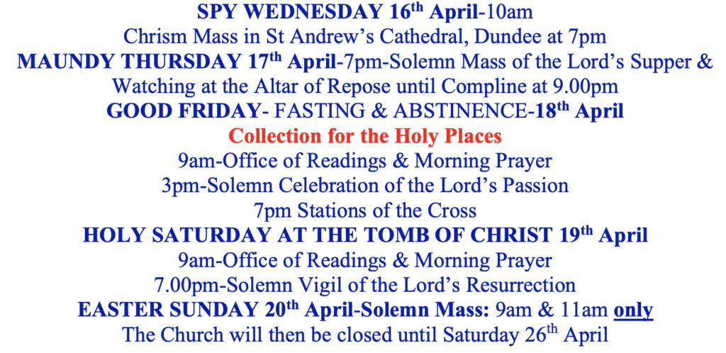 Our parish of St John the Baptist’s Perth serves the central and northern parts of the city of Perth as well as the rural areas to the north and east of the city towards Dunkeld, Coupar Angus and Errol. The parish also serves HM Prison Perth, Perth Royal Infirmary, Murray Royal Hospital, North Inch Home, Luncarty House, Catmoor Nursing Home, Strathtay House, Upper Springlands Home, Ochil, Louise Brae, Viewlands, the Grange (Balbeggie) and Kincarathie Nursing Home.
