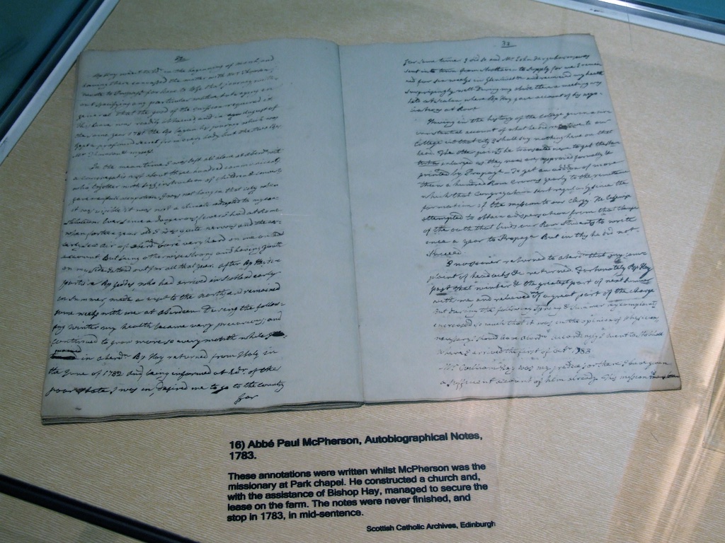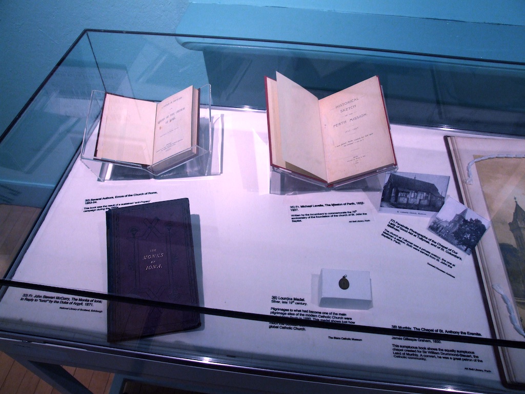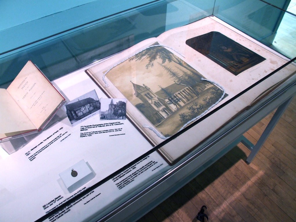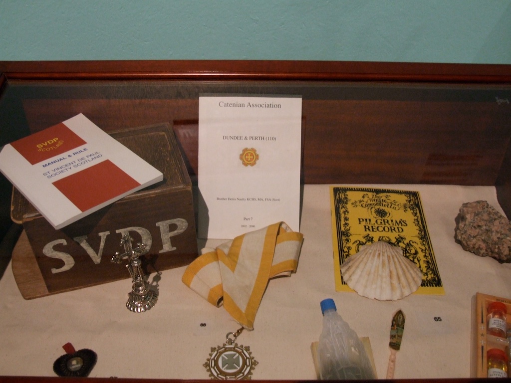 Next are the lenders. These include the Diocese of Dunkeld, the Diocese of Argyll, Blairs Museum, St. Mary’s Monastery in Kinnoull, the Polish Mission in Scotland, the Archives of the Friars Preachers, English Province, Congregation of the Ursulines of Jesus, Dunkeld Diocesan Archives, the Scottish Catholic Archives, the Scottish Catholic Media Office, Lady Willoughby de Eresby and the Grimsthorpe and Drummond Castle Trust, the AK Bell Library, the National Library of Scotland, Kilgraston School, Stirling High School, Gabriel Communications Ltd., the Black Watch Regimental Museum, the Perth Italian Society, and Flood Photographers. Besides the institutional lenders, we have been truly blessed by the phenomenal response from within the Catholic community in Perth. Many individual parishioners have provided artefacts, too many, in fact, to be named separately. To all the many who have assisted, we are truly grateful.