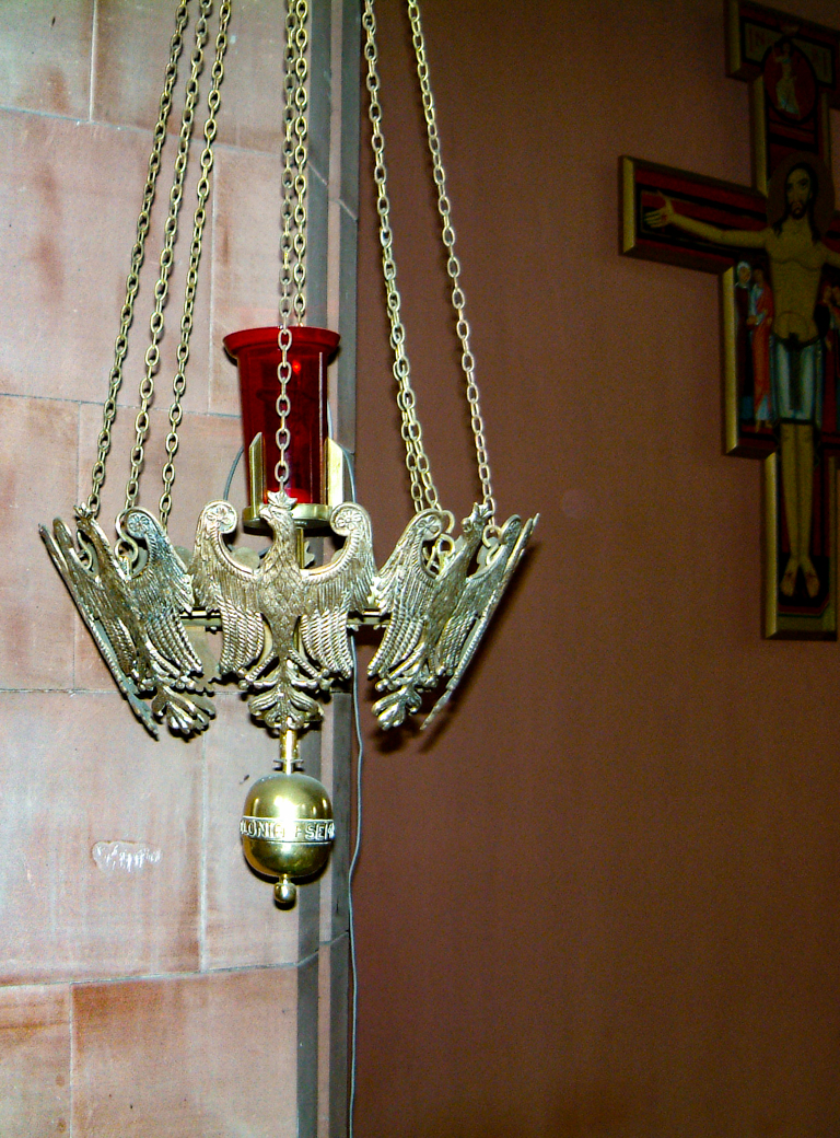 The sanctuary lamp was originally suspended from the centre of the main arch in St John’s, over the central tabernacle. When alternations were made to the sanctuary after Vatican II the tabernacle we transferred to its present position in the side chapel and part of the sanctuary lamp – consisting of a crown suspended from chains – was removed.