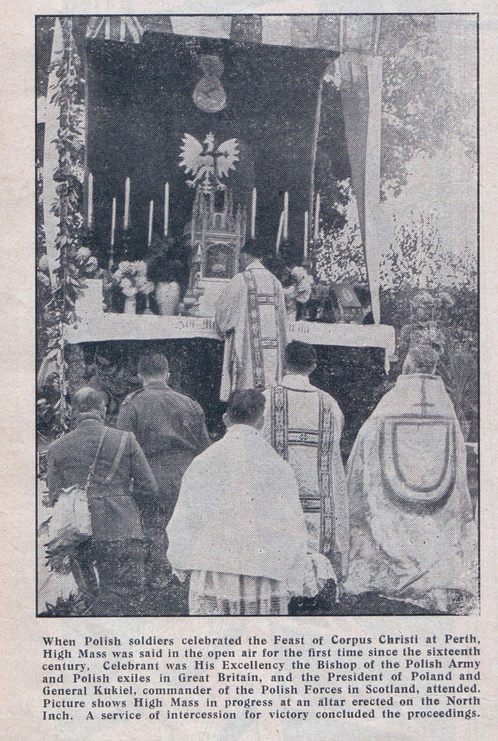 At the end of the war, on the Feast of Corpus Christi, the Polish President, Władysław Raczkiewicz, and General Kukiel joined the Polish soldiers and Polish exiles in Great Britain for High Mass, celebrated by Bishop Jozeph Gawlina at an altar erected on the Fair City’s North Inch.