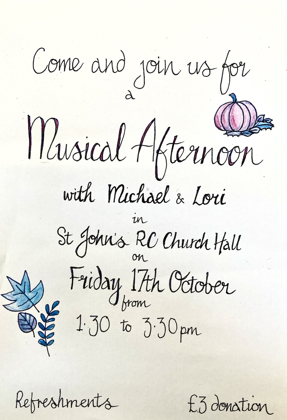 Come and join us for an Afternoon of Music with Michael and Lori – in St John the Baptist RC Church Hall on Friday 17th October, from 1.30-3.30pm – with refreshments – donations £3